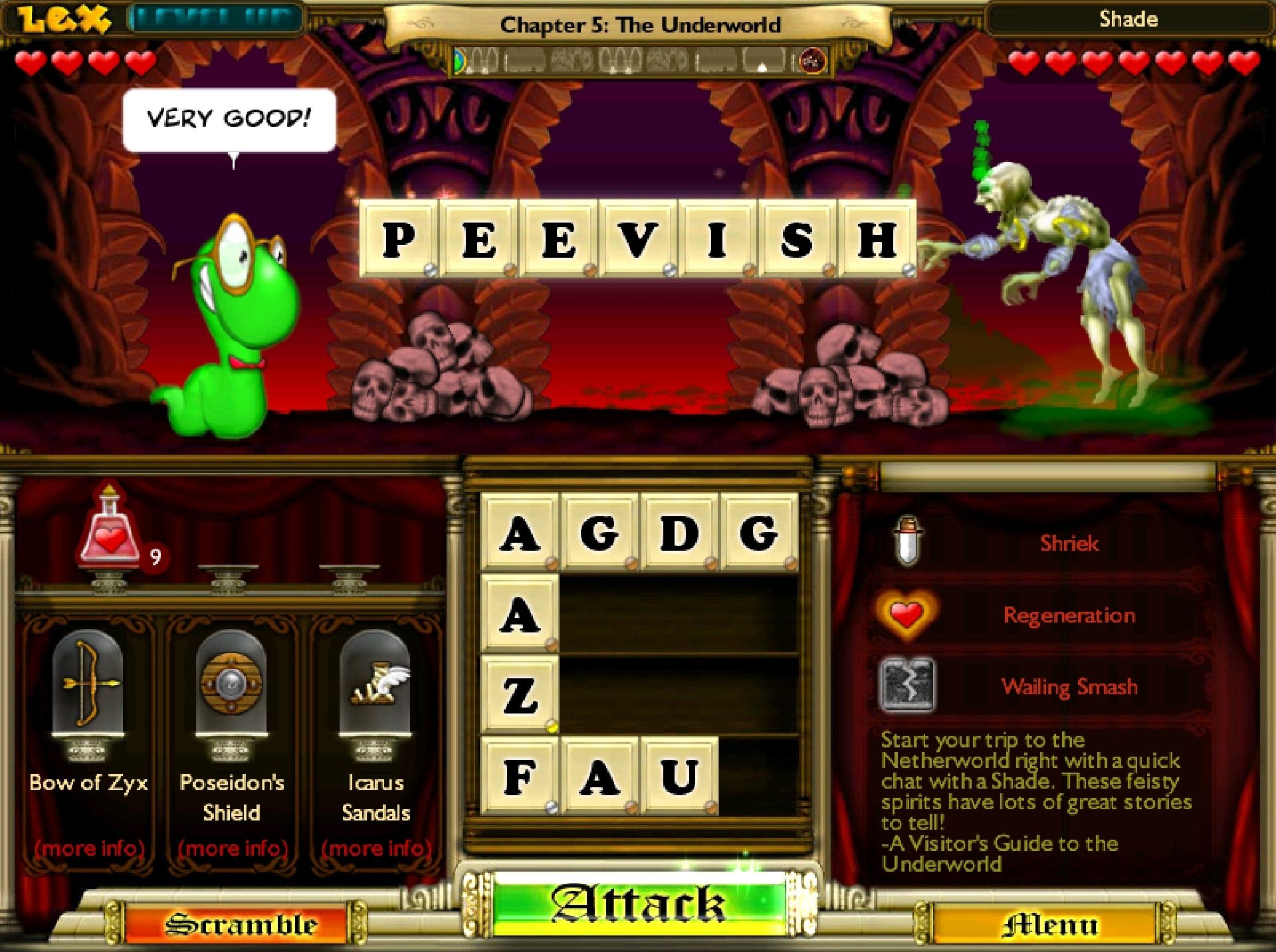 - Feed Lex the Bookworm by spelling words - the longer the word, the more points you score.