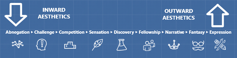 We can try to arrange core aesthetics from the most inward to the the most outward: Abnegation, Challenge, Competition, Sensation, Discovery, Fellowship, Narrative, Fantasy, Expression