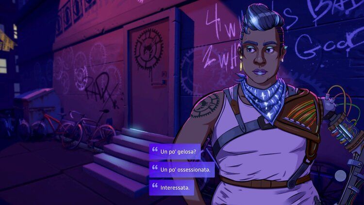 Faced with losing such an important aspect of Lina’s personality, we decided to forge ahead with a new approach. We had the opportunity to do something different, and we felt like we had to do the character justice. In a game that's completely based on dialogue, such details are crucial. What's more, the game's cyberpunk setting gave us the perfect excuse to experiment and innovate. Language evolves, so why not try to imagine a future where Italian has expanded to include a neutral pronoun in everyday conversations? It might sound a bit weird, sure, but cyberpunk literature has always employed such gimmicks. And rather than take away from a character, we could actually enrich the narrative universe with an act of "world building" instead.